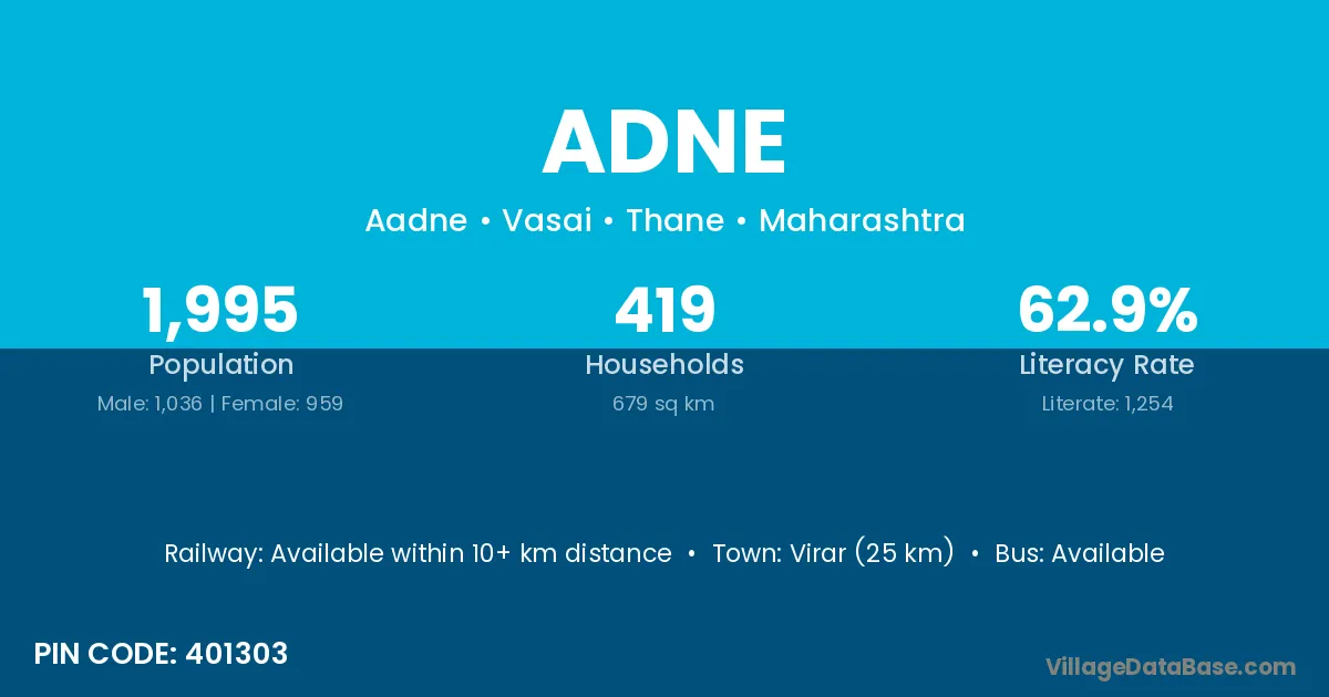 Virar (25 km) is the nearest town to Adne village for major economic activities and is located approximately 25 km away.