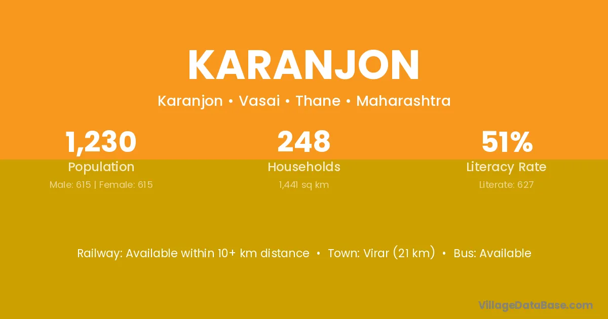 Virar (21 km) is the nearest town to Karanjon village for major economic activities and is located approximately 21 km away.