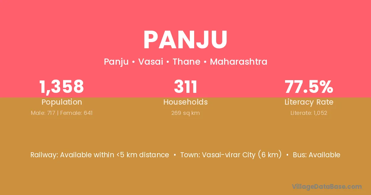 Vasai-virar City (6 km) is the nearest town to Panju village for major economic activities and is located approximately 6 km away.