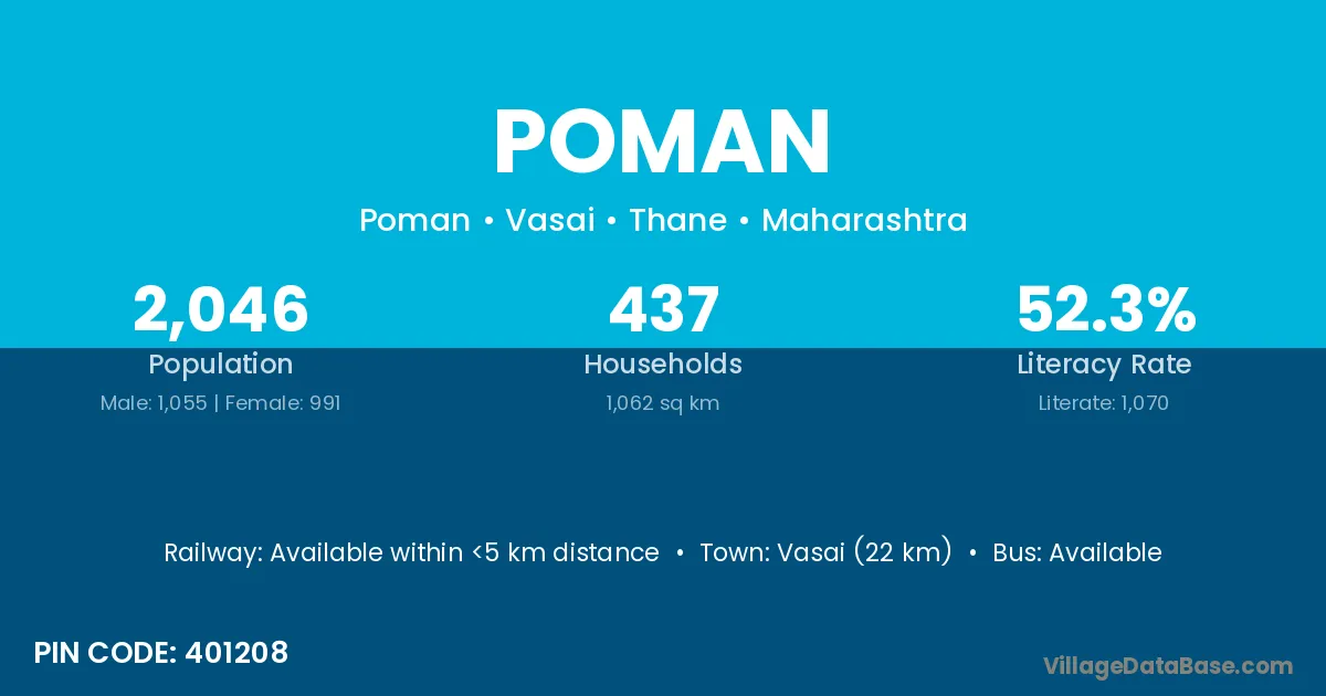 Vasai (22 km) is the nearest town to Poman village for major economic activities and is located approximately 22 km away.