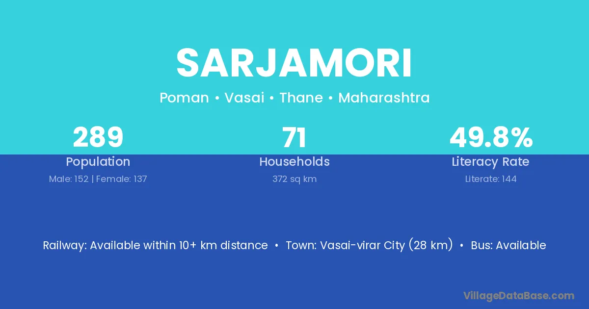 Vasai-virar City (28 km) is the nearest town to Sarjamori village for major economic activities and is located approximately 28 km away.
