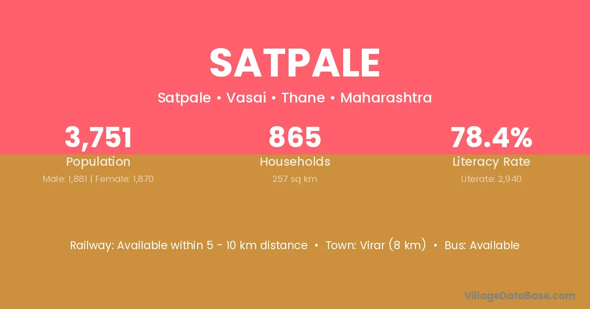 Virar (8 km) is the nearest town to Satpale village for major economic activities and is located approximately 8 km away.