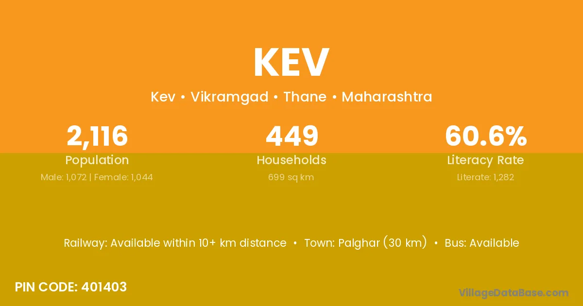 Palghar (30 km) is the nearest town to Kev village for major economic activities and is located approximately 30 km away.