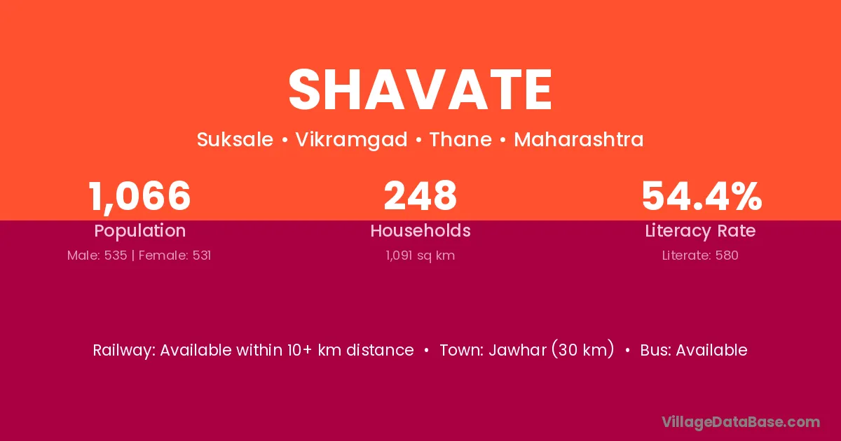 Jawhar (30 km) is the nearest town to Shavate village for major economic activities and is located approximately 30 km away.