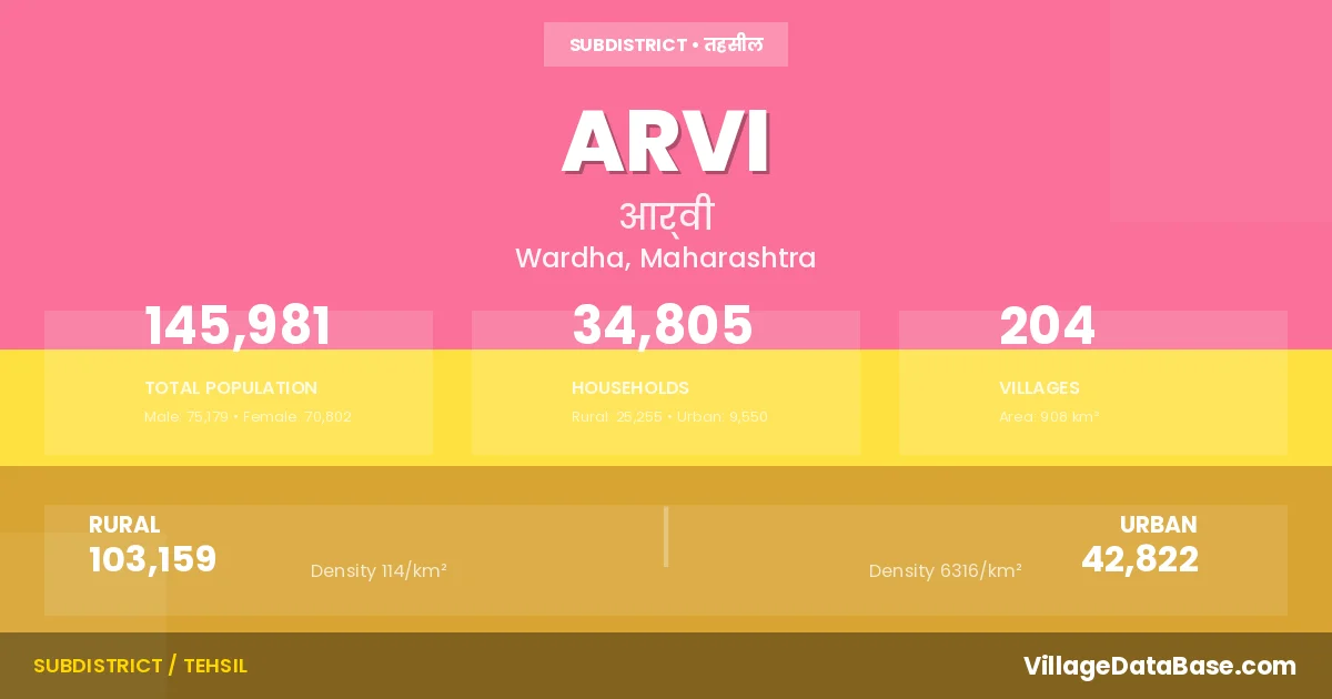 According to the 2011 census The total area of Arvi Tehsil is 908 km², with a population of 145981 people. The population density is 161 inhabitants per square kilometre, and there are approximately 34805 houses in the sub district.