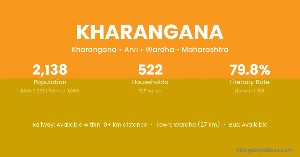 Wardha (27 km) is the nearest town to Kharangana village for major economic activities and is located approximately 27 km away.