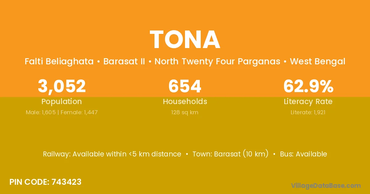 The literacy rate of Tona village is 74.20%. Male literacy stands at 79.80% and female literacy at 67.98%.