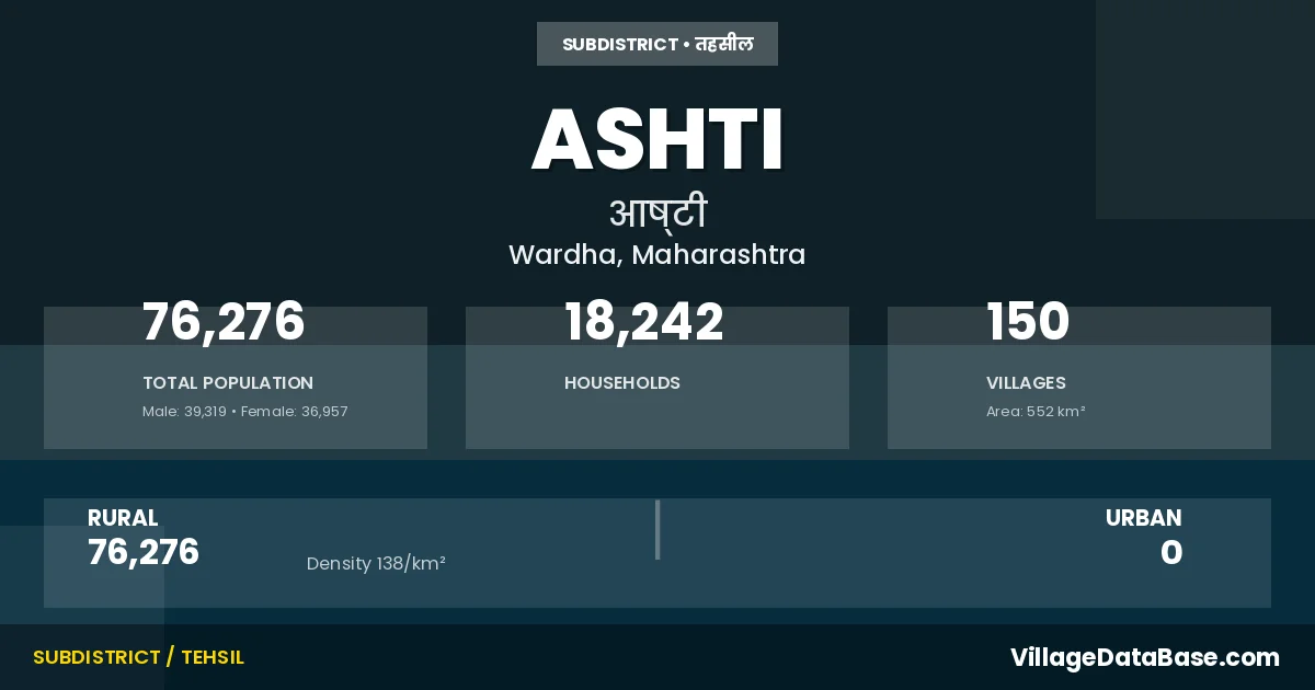 According to the 2011 census The total area of Ashti Tehsil is 552 km², with a population of 76276 people. The population density is 138 inhabitants per square kilometre, and there are approximately 18242 houses in the sub district.