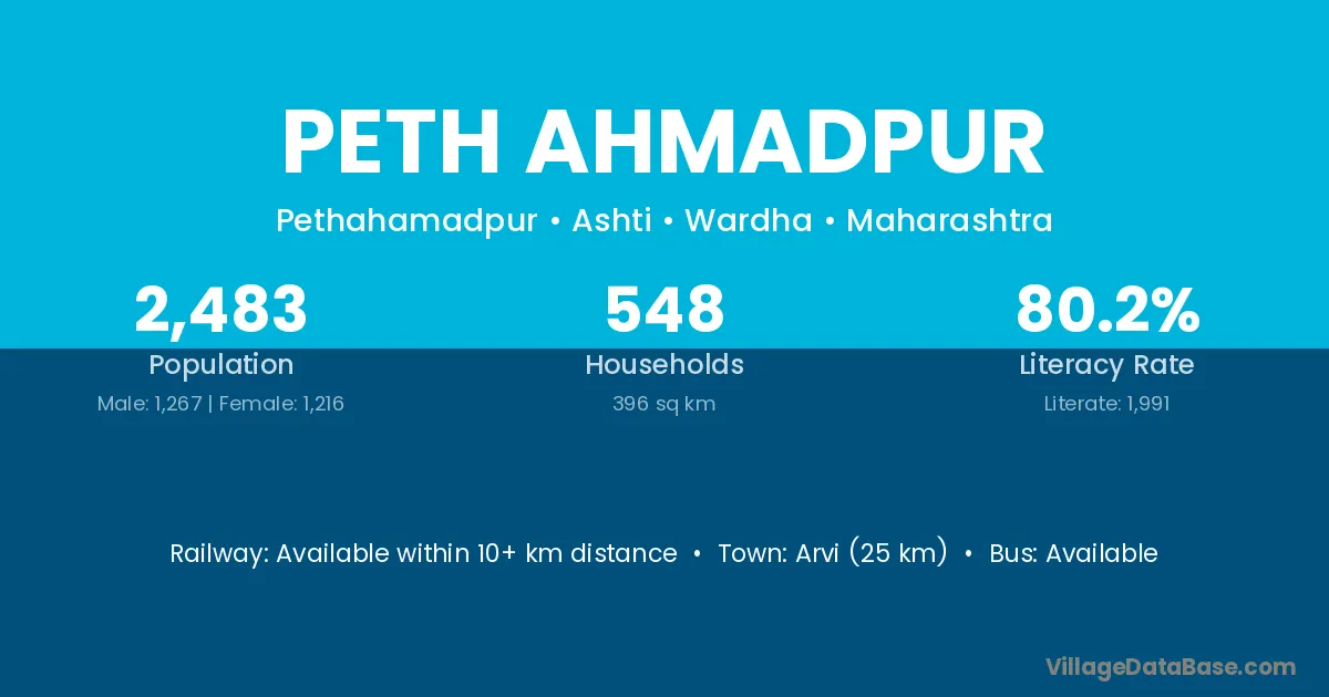 Arvi (25 km) is the nearest town to Peth Ahmadpur village for major economic activities and is located approximately 25 km away.