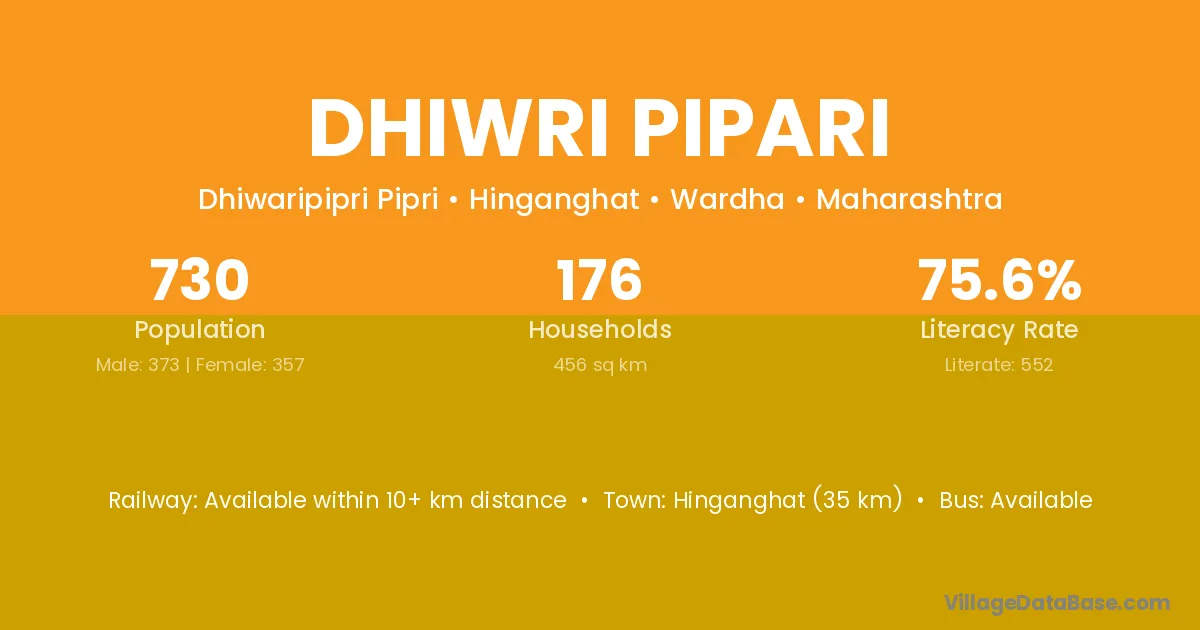 Hinganghat (35 km) is the nearest town to Dhiwri Pipari village for major economic activities and is located approximately 35 km away.