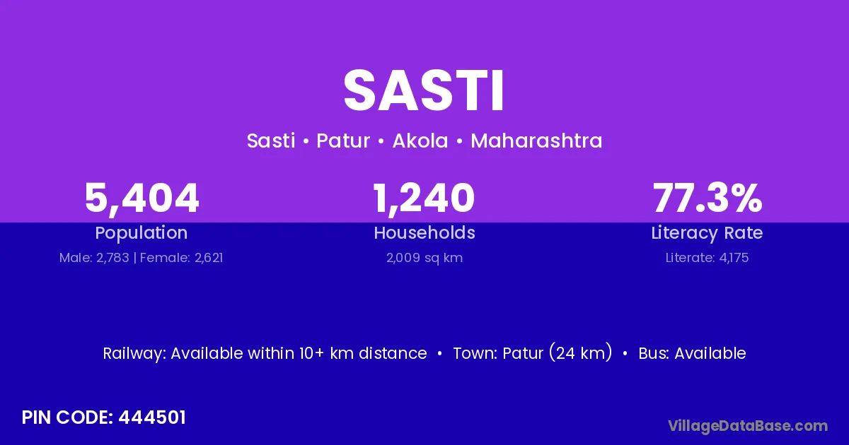 Hinganghat (40 km) is the nearest town to Sasti village for major economic activities and is located approximately 40 km away.