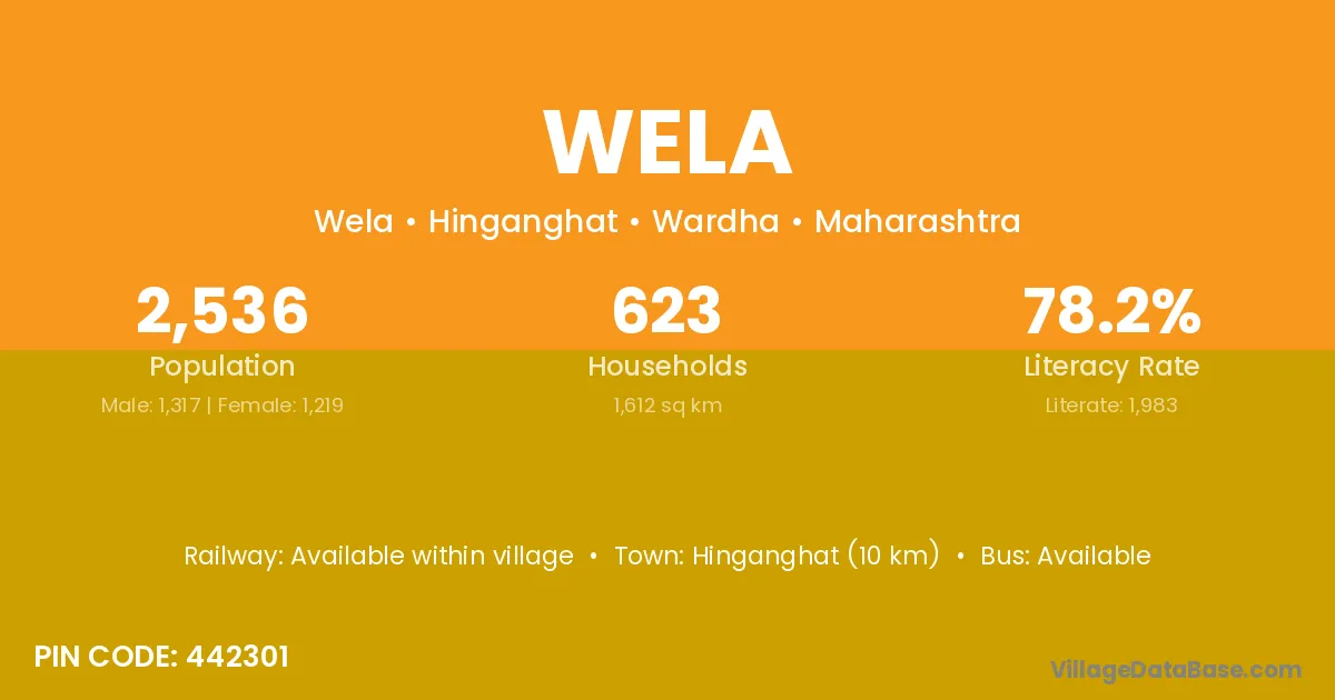 Hinganghat (10 km) is the nearest town to Wela village for major economic activities and is located approximately 10 km away.