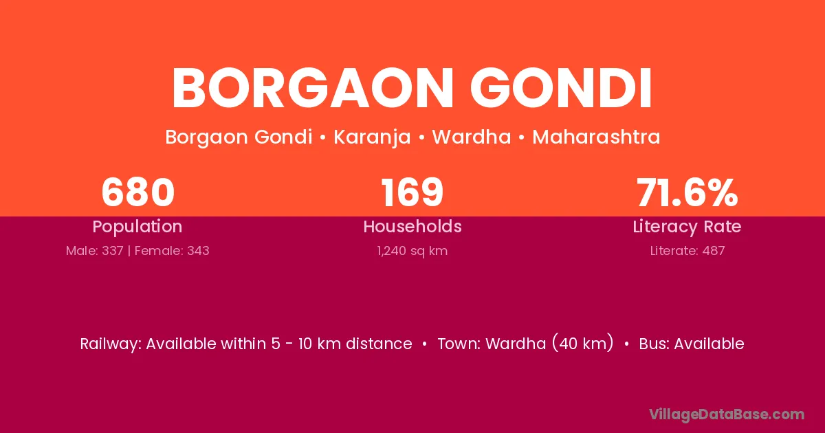 Wardha (40 km) is the nearest town to Borgaon Gondi village for major economic activities and is located approximately 40 km away.