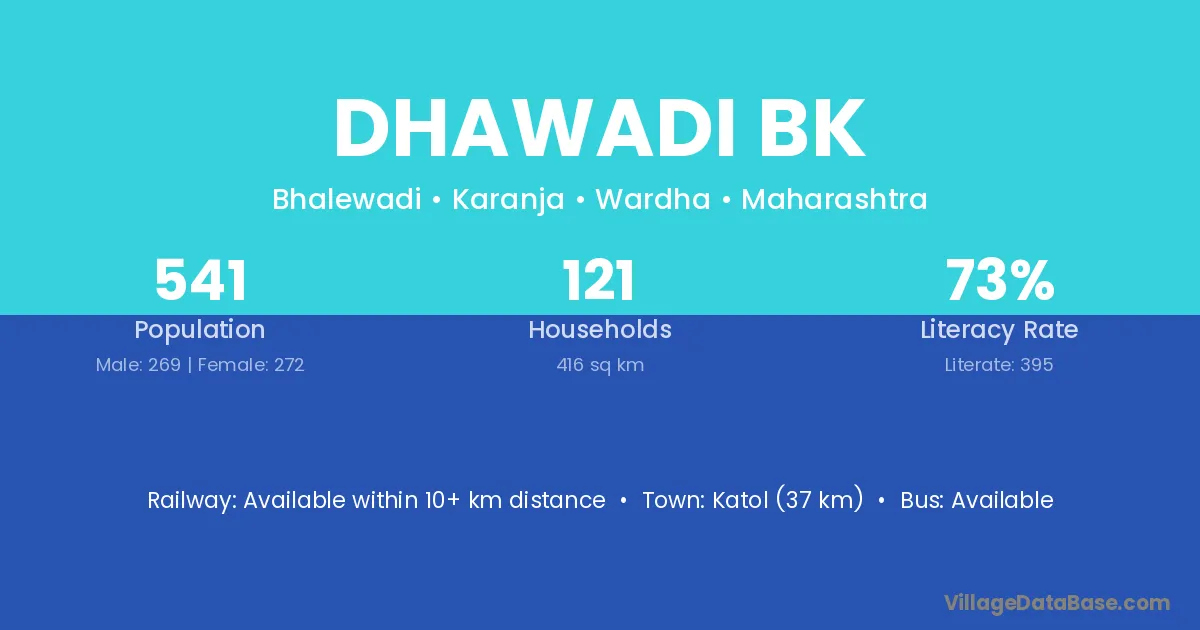 Katol (37 km) is the nearest town to Dhawadi Bk village for major economic activities and is located approximately 37 km away.
