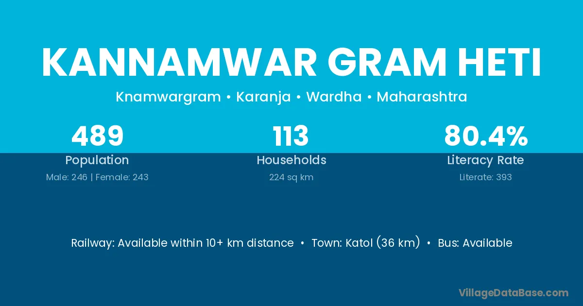 Kannamwar Gram Heti village has a total population of 489 people, of which 246 are males and 243 are females.