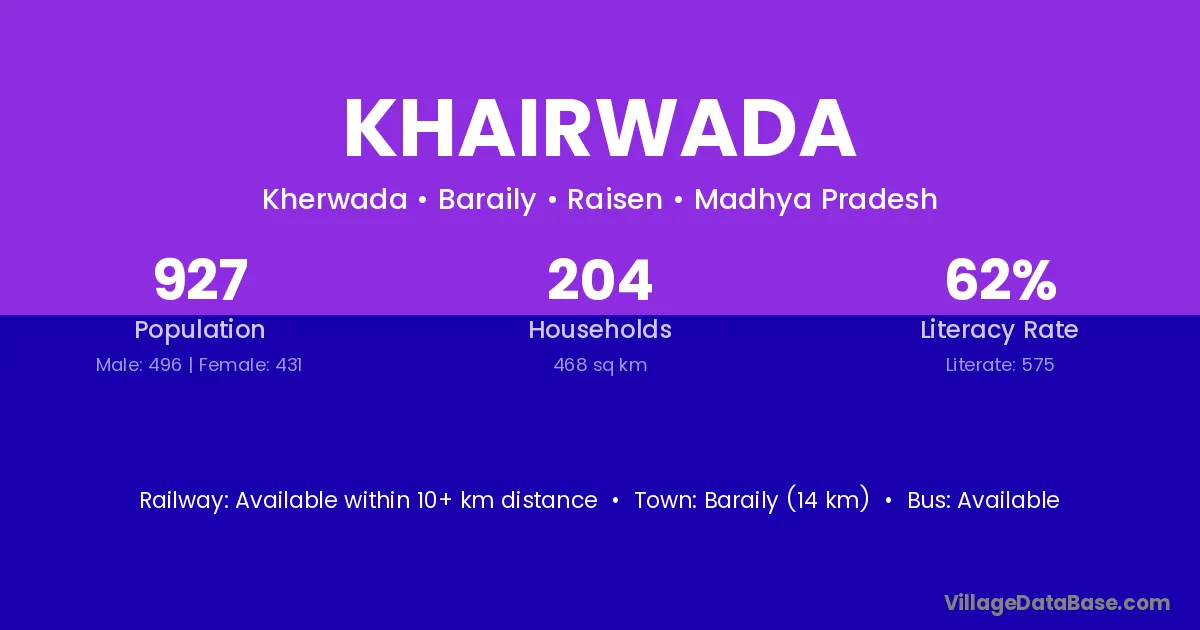 Arvi (27 km) is the nearest town to Khairwada village for major economic activities and is located approximately 27 km away.