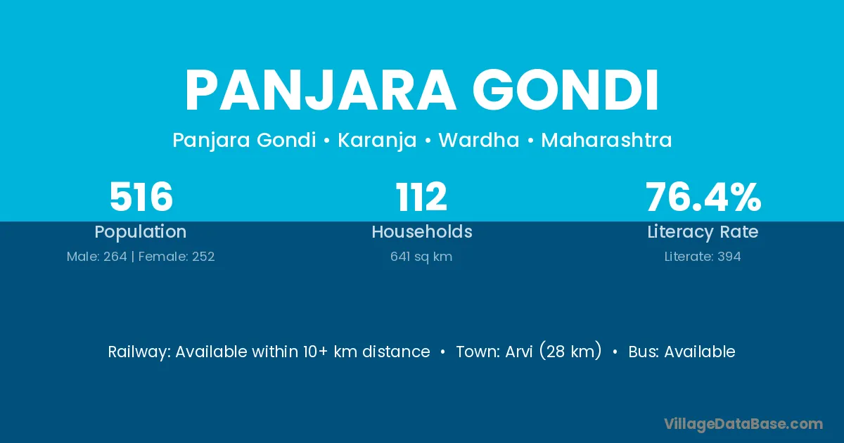 Arvi (28 km) is the nearest town to Panjara Gondi village for major economic activities and is located approximately 28 km away.