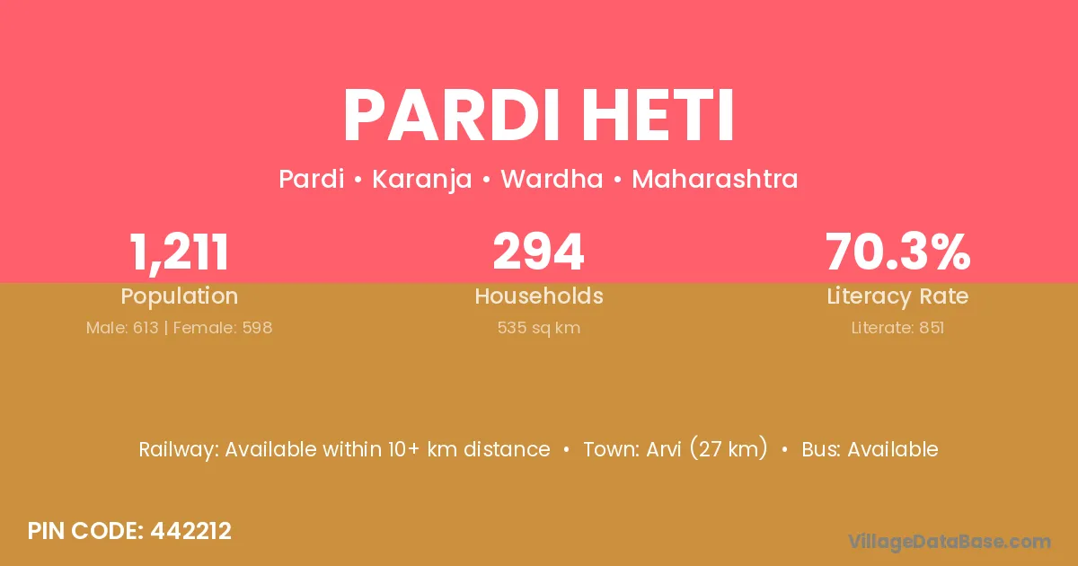 Arvi (27 km) is the nearest town to Pardi Heti village for major economic activities and is located approximately 27 km away.