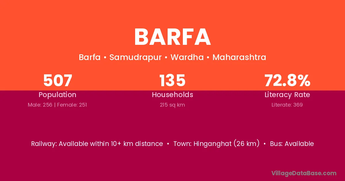 Hinganghat (26 km) is the nearest town to Barfa village for major economic activities and is located approximately 26 km away.
