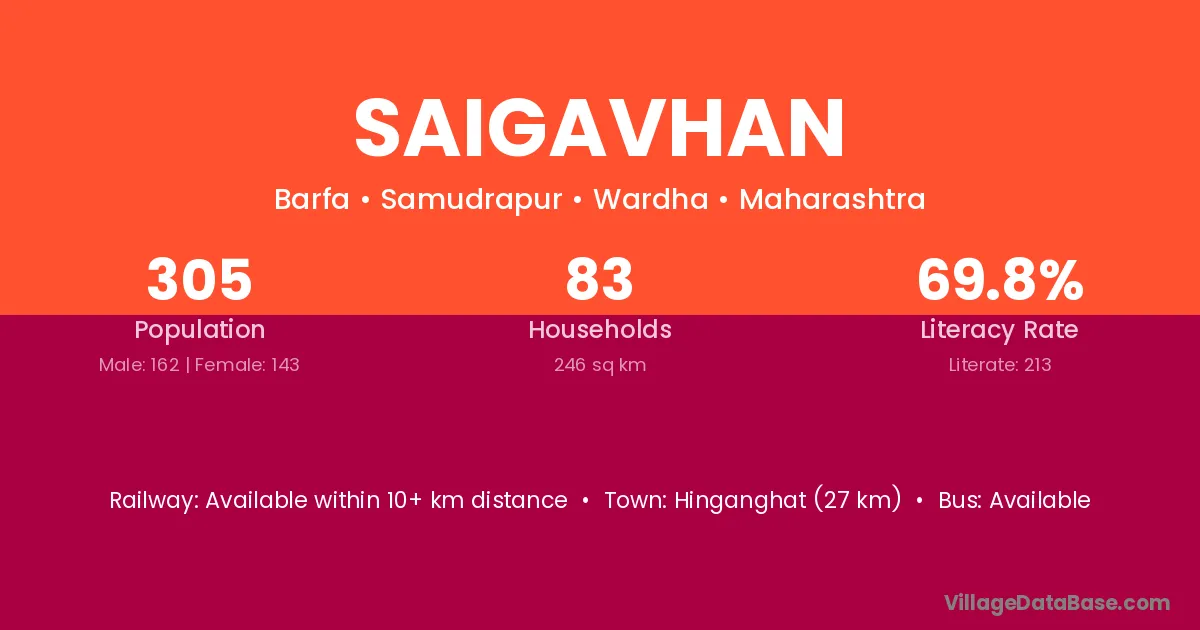 Hinganghat (27 km) is the nearest town to Saigavhan village for major economic activities and is located approximately 27 km away.