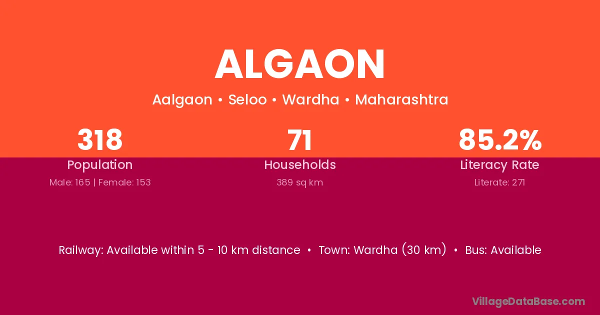 Wardha (30 km) is the nearest town to Algaon village for major economic activities and is located approximately 30 km away.