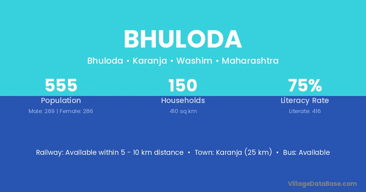 Karanja (25 km) is the nearest town to Bhuloda village for major economic activities and is located approximately 25 km away.