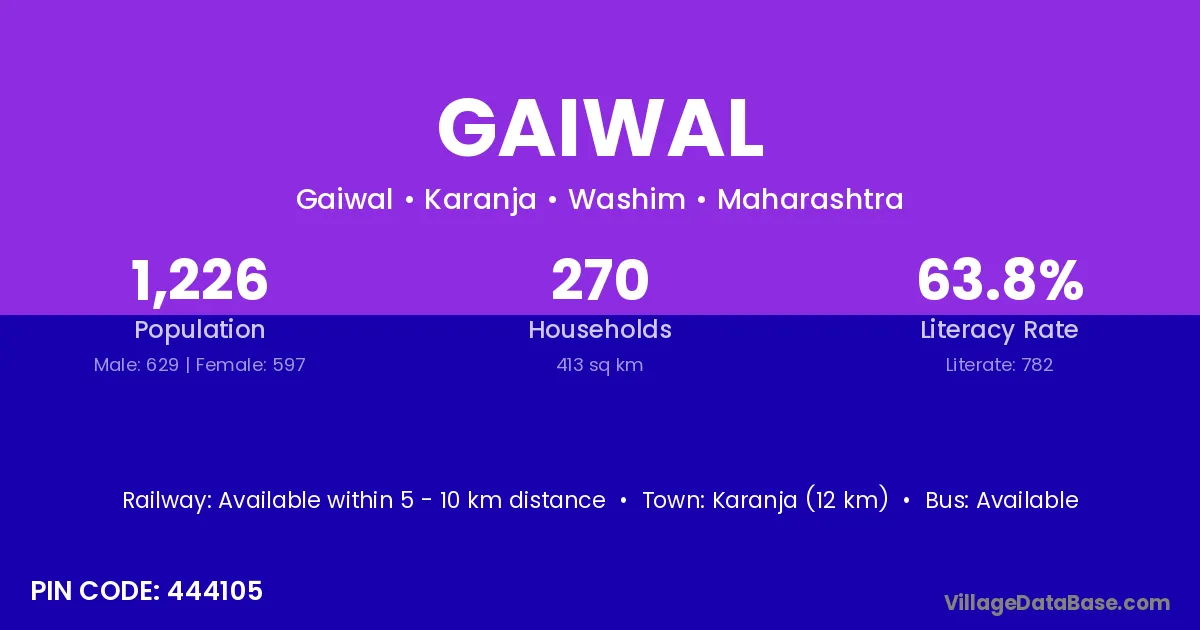 Karanja (12 km) is the nearest town to Gaiwal village for major economic activities and is located approximately 12 km away.