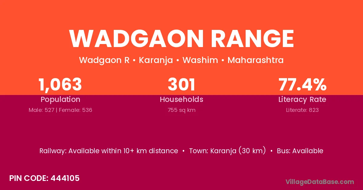 Karanja (30 km) is the nearest town to Wadgaon Range village for major economic activities and is located approximately 30 km away.