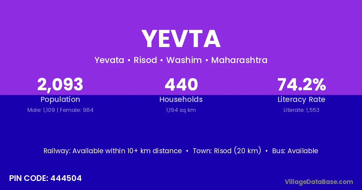 Karanja (13 km) is the nearest town to Yevta village for major economic activities and is located approximately 13 km away.