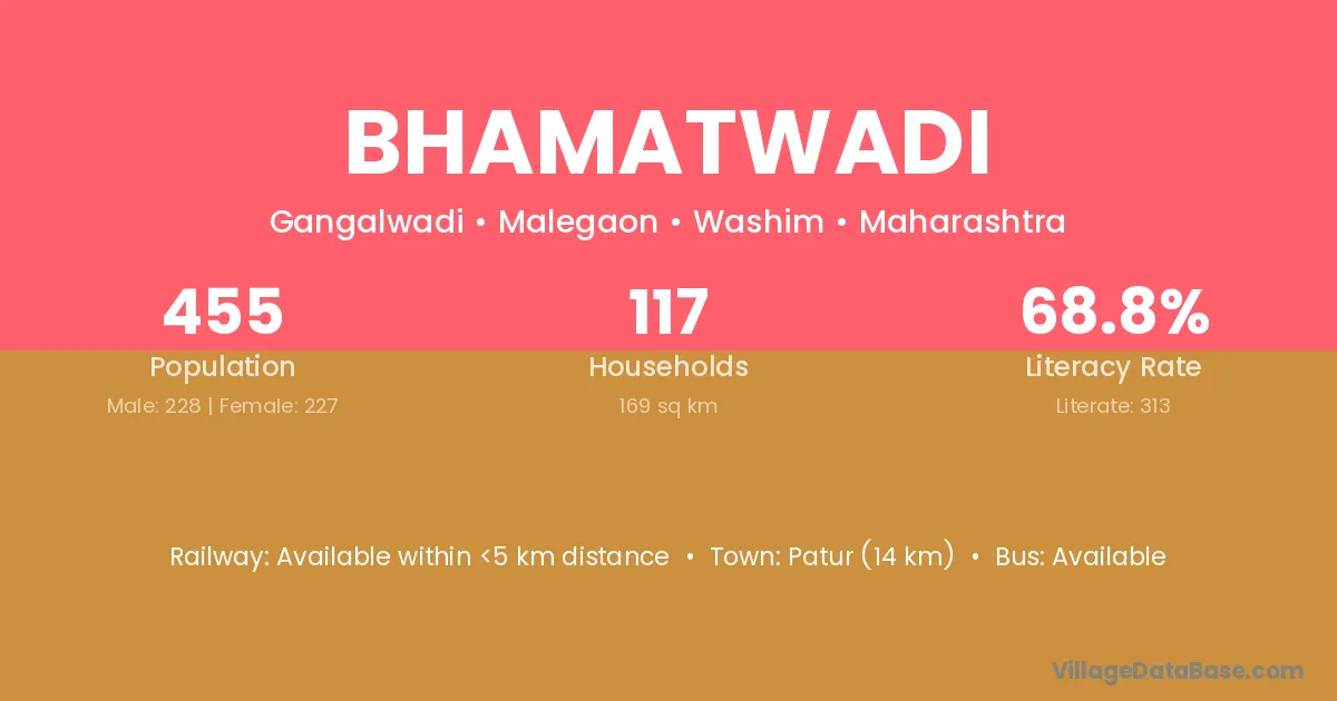 Bhamatwadi village has a total population of 455 people, of which 228 are males and 227 are females.