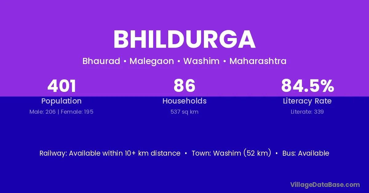Washim (52 km) is the nearest town to Bhildurga village for major economic activities and is located approximately 52 km away.