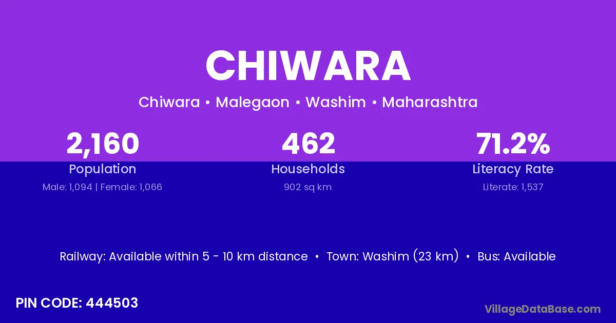 Washim (23 km) is the nearest town to Chiwara village for major economic activities and is located approximately 23 km away.
