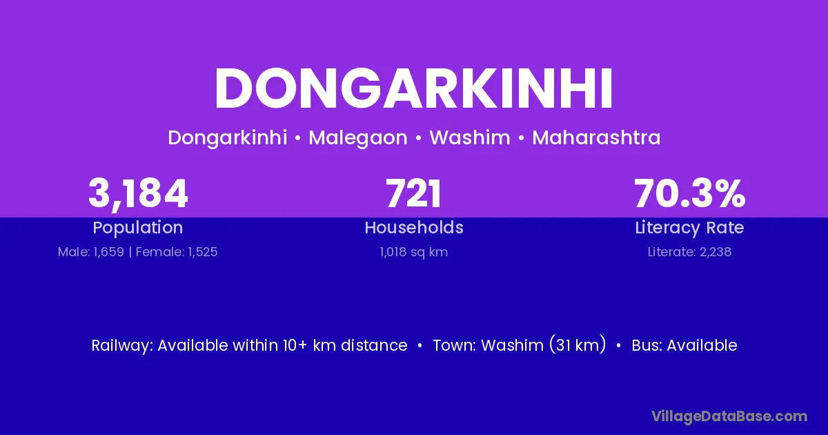 Washim (31 km) is the nearest town to Dongarkinhi village for major economic activities and is located approximately 31 km away.
