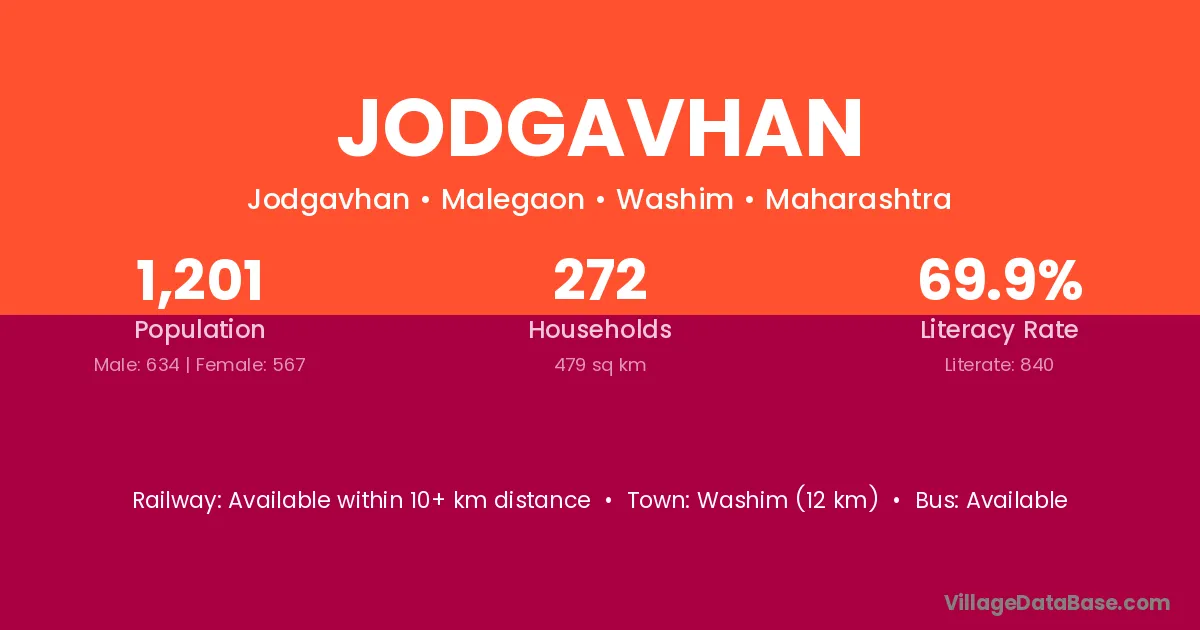 Washim (12 km) is the nearest town to Jodgavhan village for major economic activities and is located approximately 12 km away.