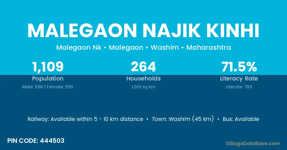 Malegaon Najik Kinhi village has a total population of 1,109 people, of which 559 are males and 550 are females.