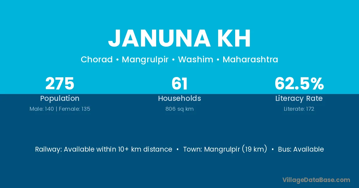 Mangrulpir (19 km) is the nearest town to Januna Kh village for major economic activities and is located approximately 19 km away.