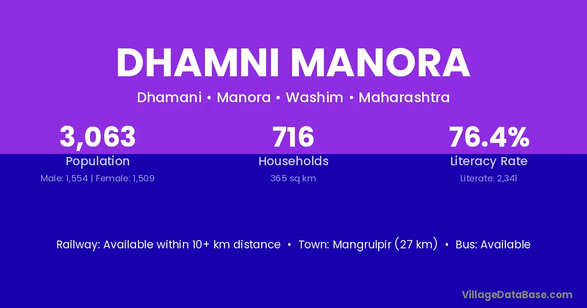 Mangrulpir (27 km) is the nearest town to Dhamni Manora village for major economic activities and is located approximately 27 km away.