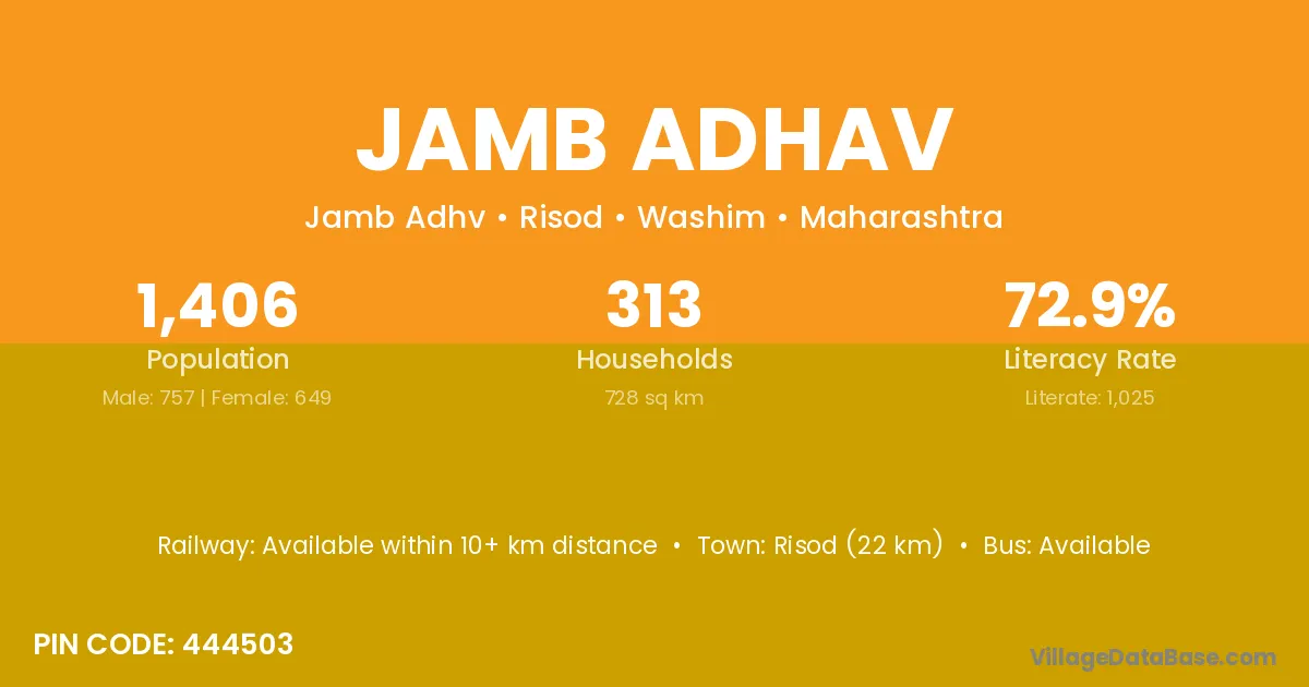 Risod (22 km) is the nearest town to Jamb Adhav village for major economic activities and is located approximately 22 km away.