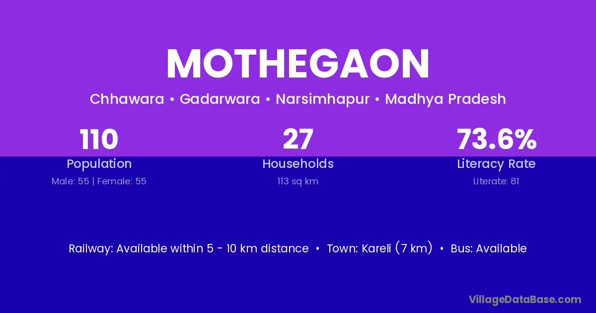 The literacy rate of Mothegaon village is 72.42%. Male literacy stands at 79.01% and female literacy at 65.43%.