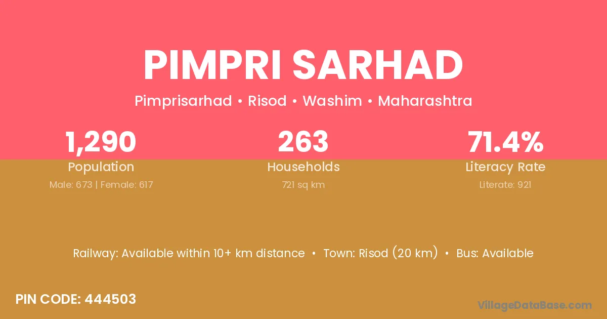 Risod (20 km) is the nearest town to Pimpri Sarhad village for major economic activities and is located approximately 20 km away.