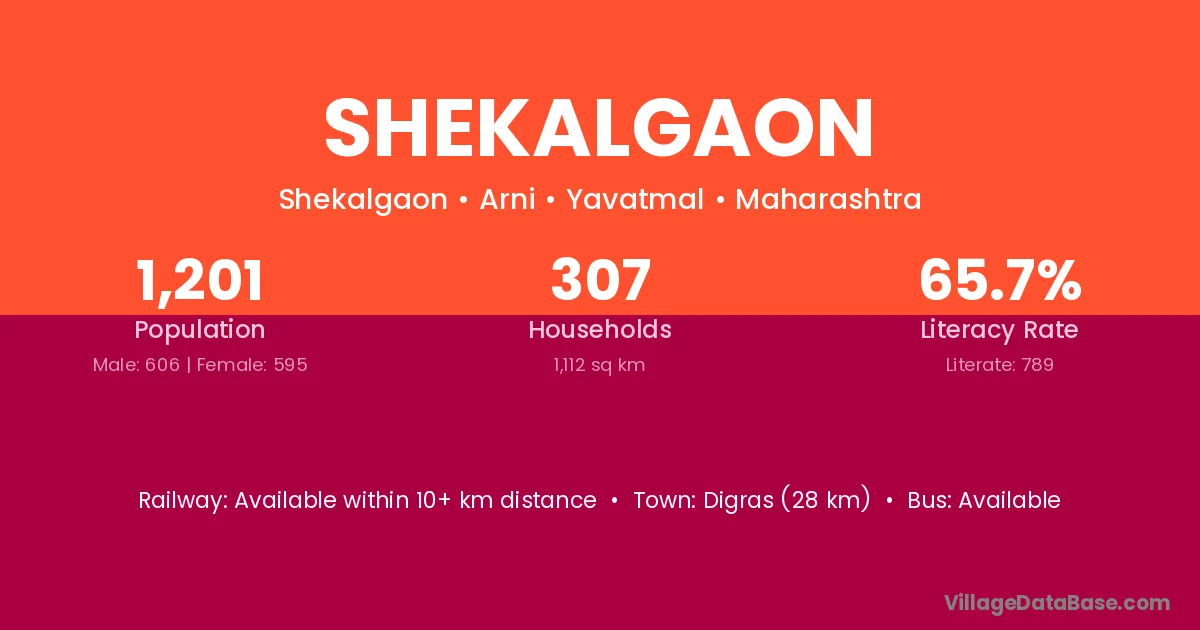 Shekalgaon village has a total population of 1,201 people, of which 606 are males and 595 are females.