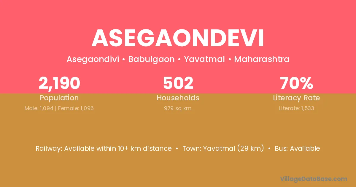 Yavatmal (29 km) is the nearest town to Asegaondevi village for major economic activities and is located approximately 29 km away.