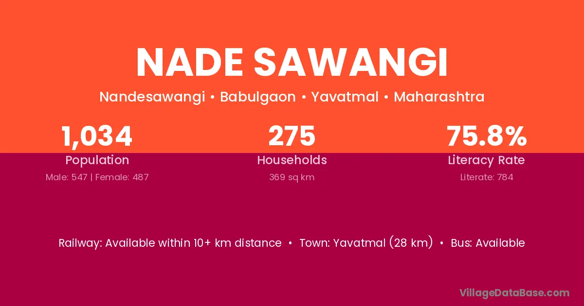 Yavatmal (28 km) is the nearest town to Nade Sawangi village for major economic activities and is located approximately 28 km away.