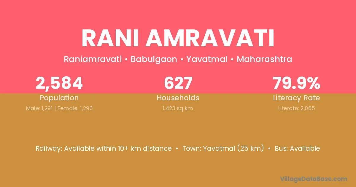 Yavatmal (25 km) is the nearest town to Rani Amravati village for major economic activities and is located approximately 25 km away.