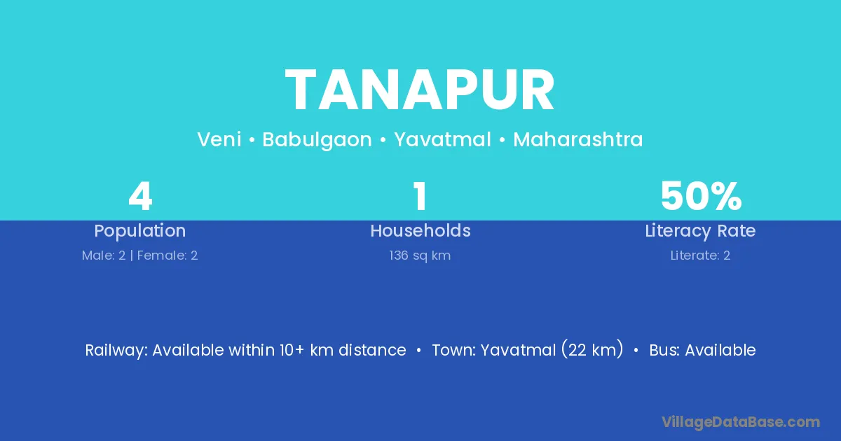 Yavatmal (22 km) is the nearest town to Tanapur village for major economic activities and is located approximately 22 km away.