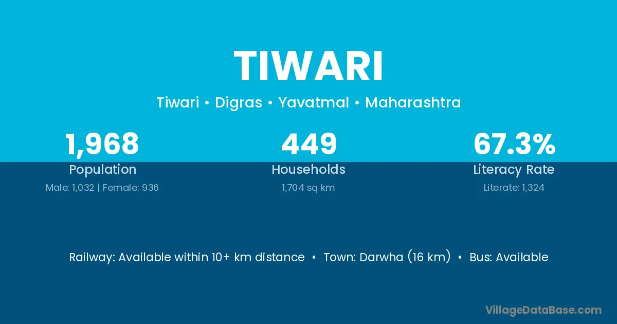 Darwha (16 km) is the nearest town to Tiwari village for major economic activities and is located approximately 16 km away.
