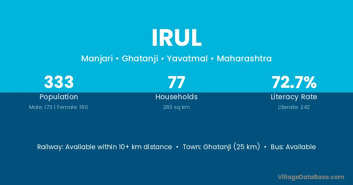 Ghatanji (25 km) is the nearest town to Irul village for major economic activities and is located approximately 25 km away.