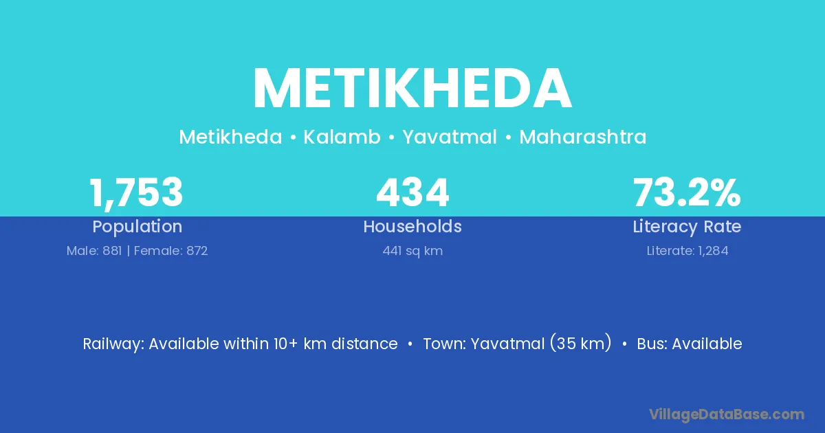Yavatmal (35 km) is the nearest town to Metikheda village for major economic activities and is located approximately 35 km away.