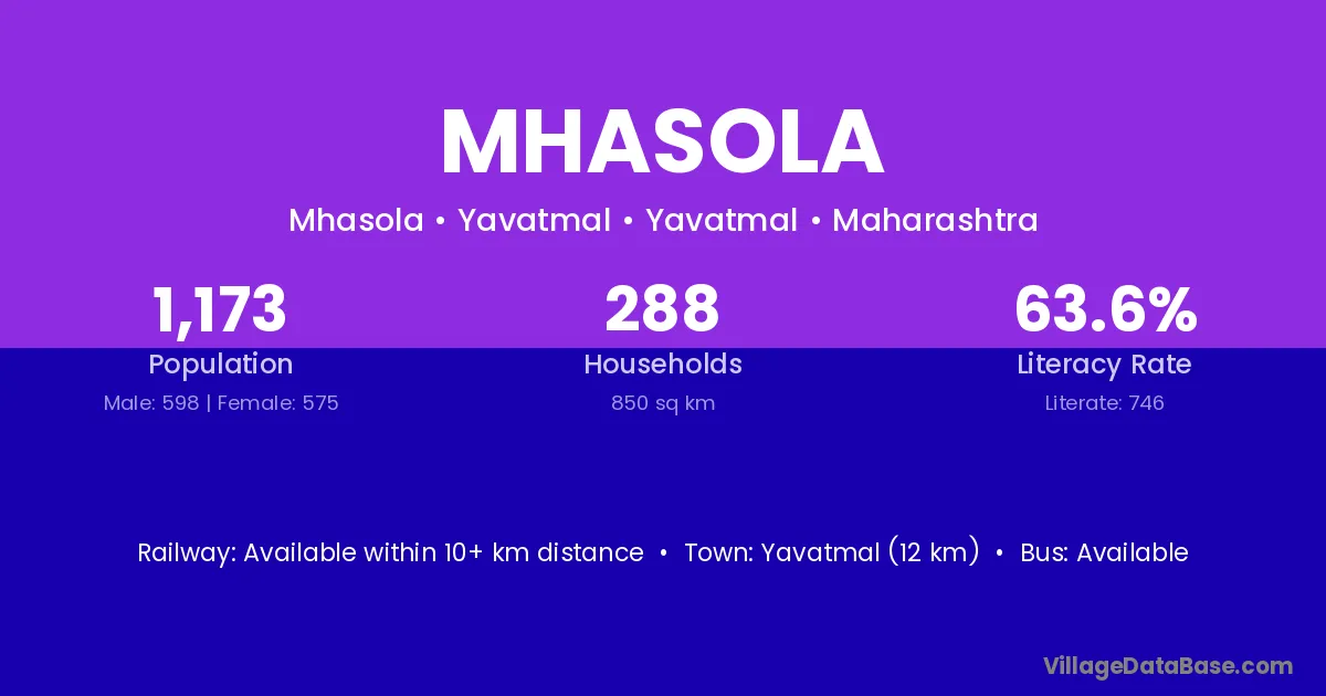 Yavatmal (28 km) is the nearest town to Mhasola village for major economic activities and is located approximately 28 km away.