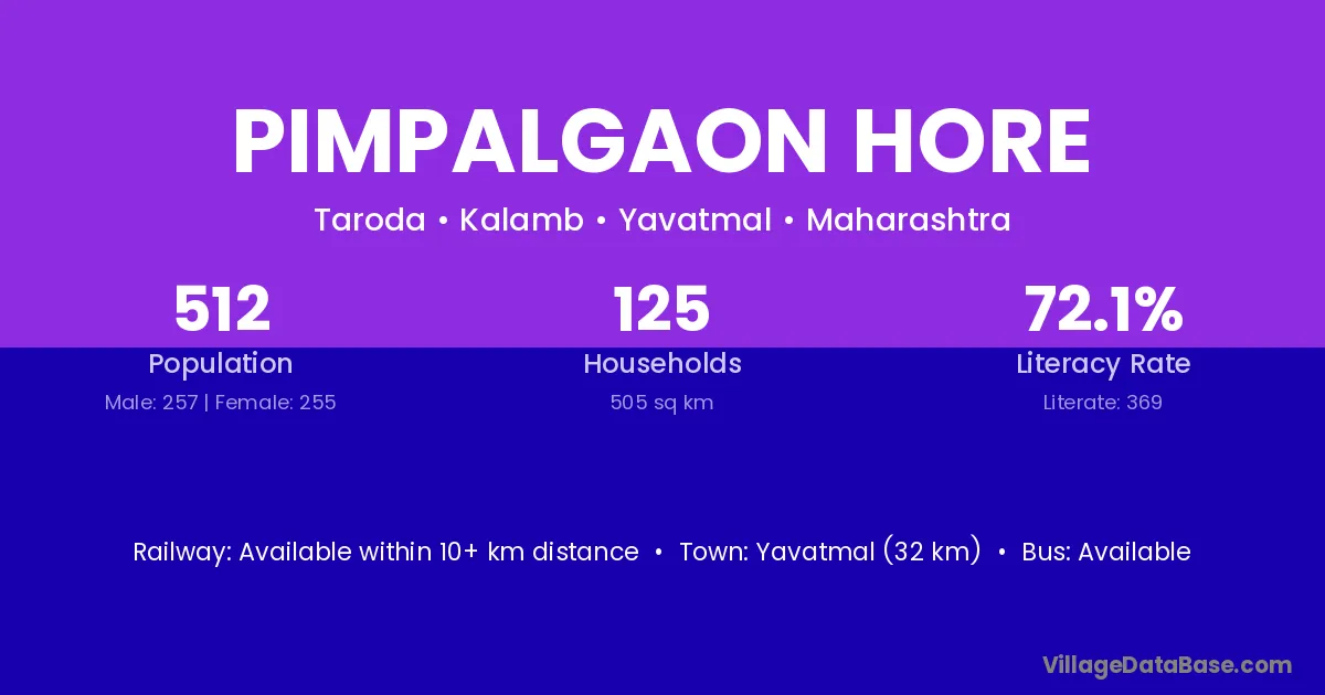 Pimpalgaon Hore village has a total population of 512 people, of which 257 are males and 255 are females.